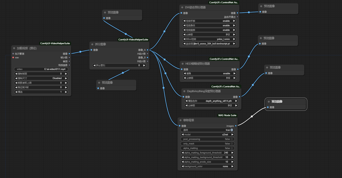 从加载的视频中截取出一些图片,使用controlnet处理图片得到图片的遮罩图,姿态图,骨骼图等进行处理。